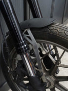These beautifully finished front fenders are specially made for custom bikes with a Suzuki GSX-R fork conversion. The black fenders are very neat due to the textured finish. The brackets are made of 3mm stainless steel, and can be sprayed in color if desired. Because the brackets have a slotted hole, the fender is adjustable in height.