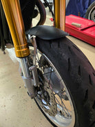 These beautifully finished front fenders are specially made for the Triumph Thruxton R / RS / TFC. The black fenders are very neat due to the textured finish. The brackets are made of 3mm stainless steel, and can be sprayed in color if desired. Because the brackets have a slotted hole, the fender is adjustable in height.