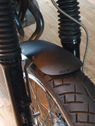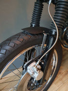 These beautifully finished front fenders are specially made for the Honda FOUR CB500, 550, and 750. The black fenders are very neat due to the textured finish. The brackets are made of 3mm stainless steel, and can be sprayed in color if desired. Because the brackets have a slotted hole, the fender is adjustable in height.