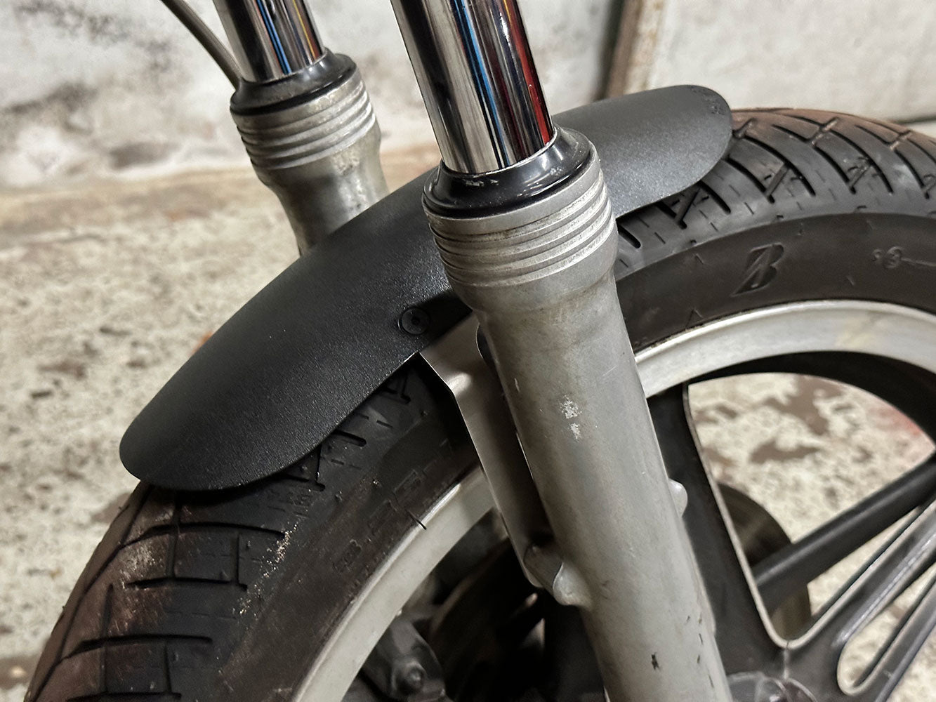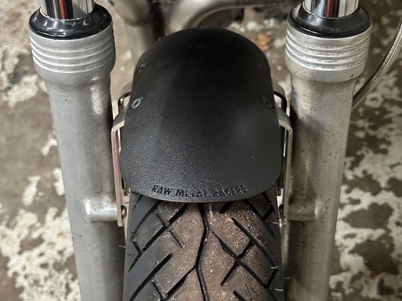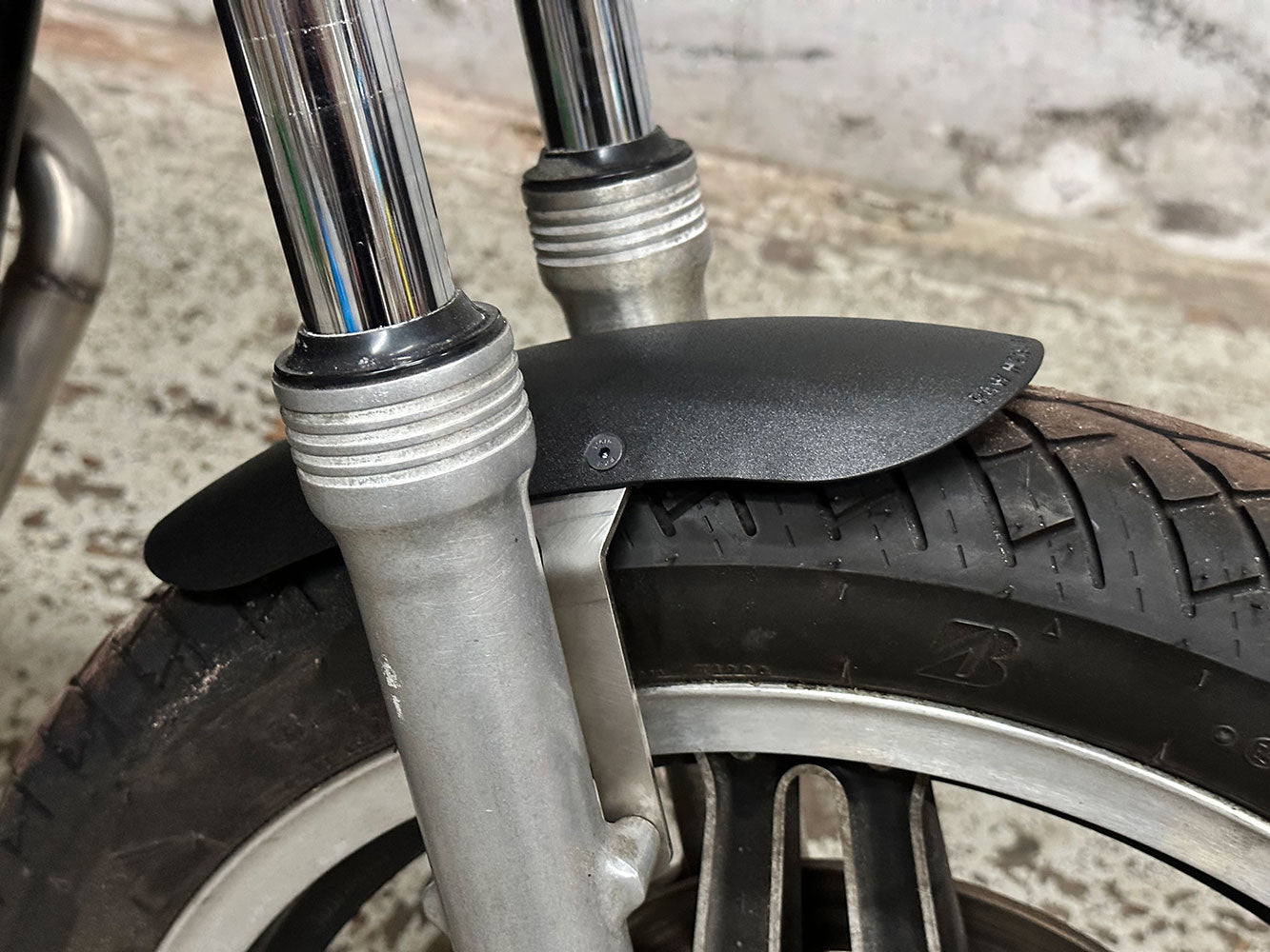 These beautifully finished front fenders are specially made for the Honda CX500. The black fenders are very neat due to the textured finish. The brackets are made of 3mm stainless steel, and can be sprayed in color if desired. Because the brackets have a slotted hole, the fender is adjustable in height.
