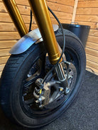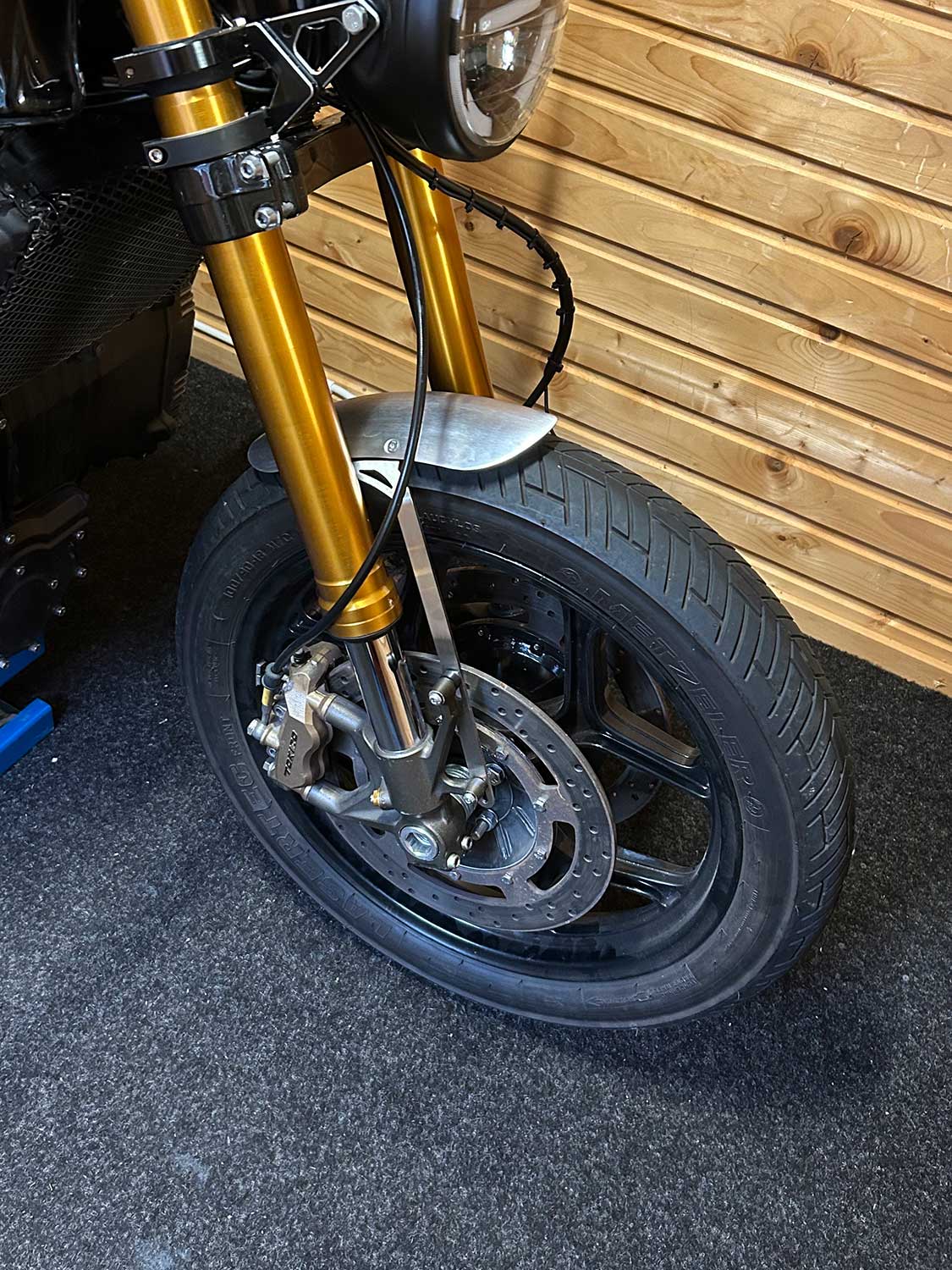 These beautifully finished front fenders are specially made for custom bikes with a Kawasaki Ninja ZX-6R / ZX-10R fork conversion. The black fenders are very neat due to the textured finish. The brackets are made of 3mm stainless steel, and can be sprayed in color if desired. Because the brackets have a slotted hole, the fender is adjustable in height.