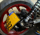 By bending your license plate in the radius of the wheel, your license plate becomes one with the shapes of the bike. A straight (unbend) license plate will also fit on the bracket.