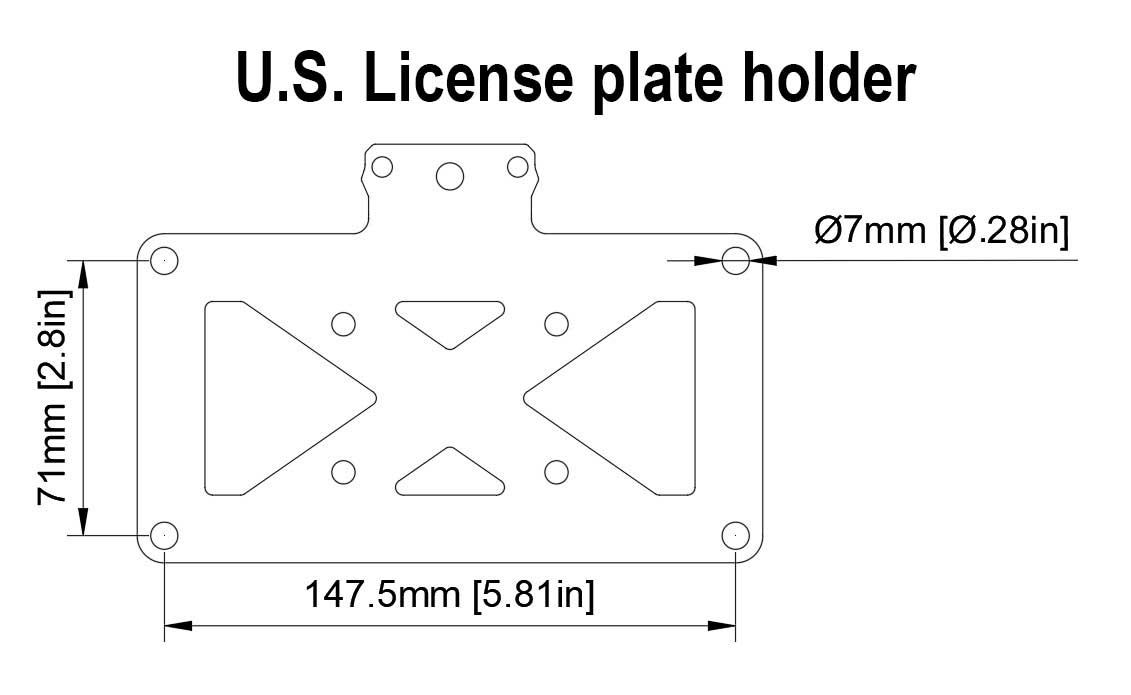 Optional plate holders with LED lighting are available for: Dutch (210×143 mm), German (180×200 mm), and U.S. (7×4 in / 178×102 mm) license plates.