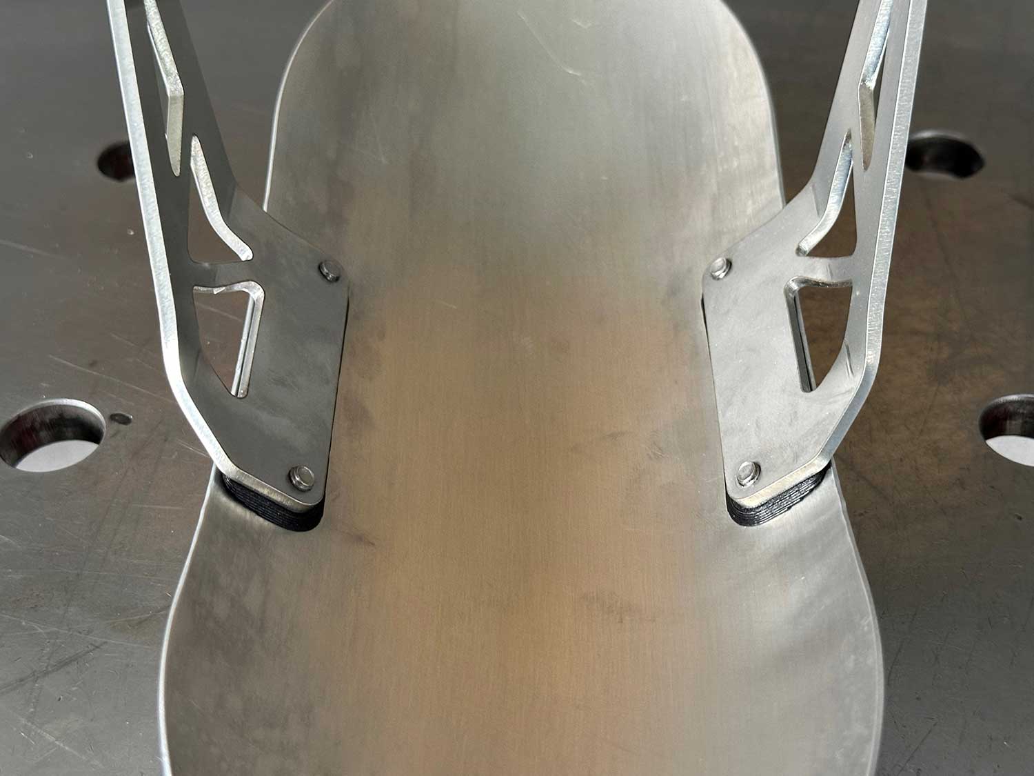 These beautifully finished front fenders are specially made for the Triumph Scrambler 400 X. The brushed aluminium fenders are crafted with great pride. The brackets are made of 3mm stainless steel, and both the fender and brackets can be painted in color if desired. Because the brackets have a slotted hole, the fender is adjustable in height.