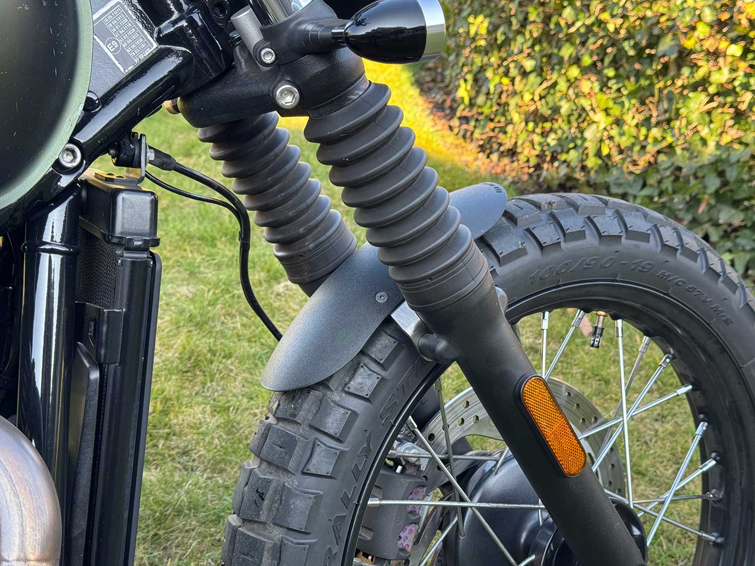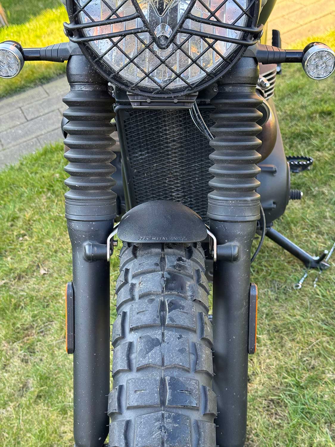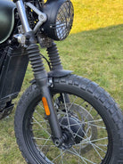 These beautifully finished front fenders are specially made for the Triumph Bonneville T100 LC, Street Cup/Twin/Scrambler. The black fenders are very neat due to the textured finish. The brackets are made of 3mm stainless steel, and can be sprayed in color if desired. Because the brackets have a slotted hole, the fender is adjustable in height.