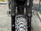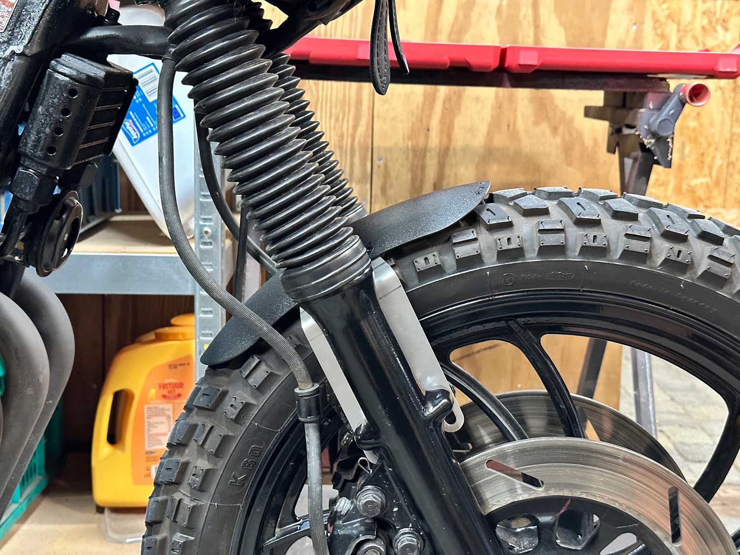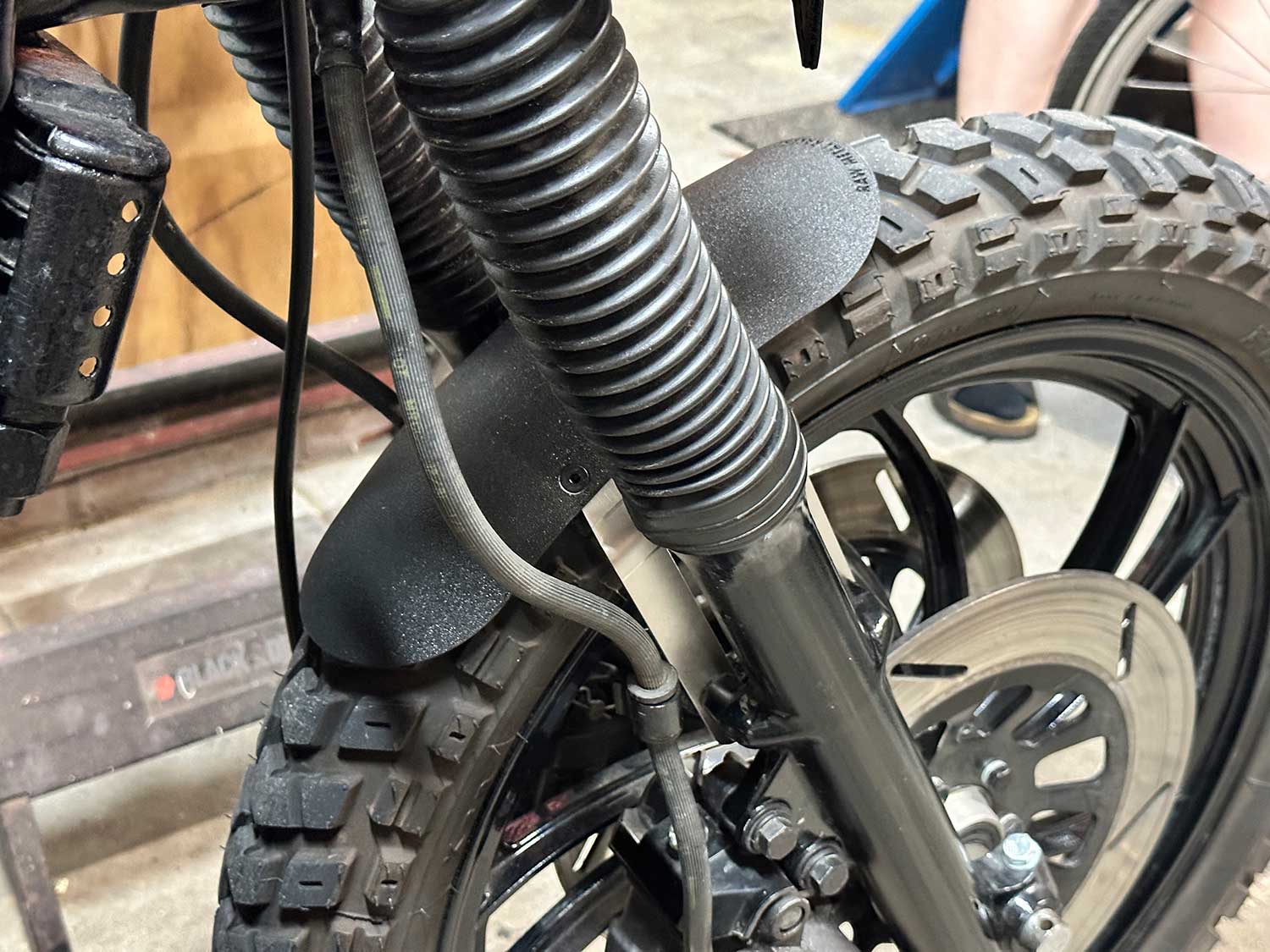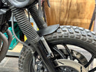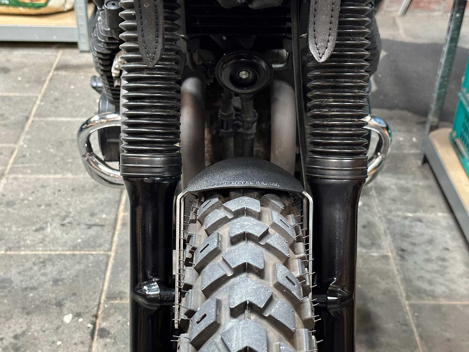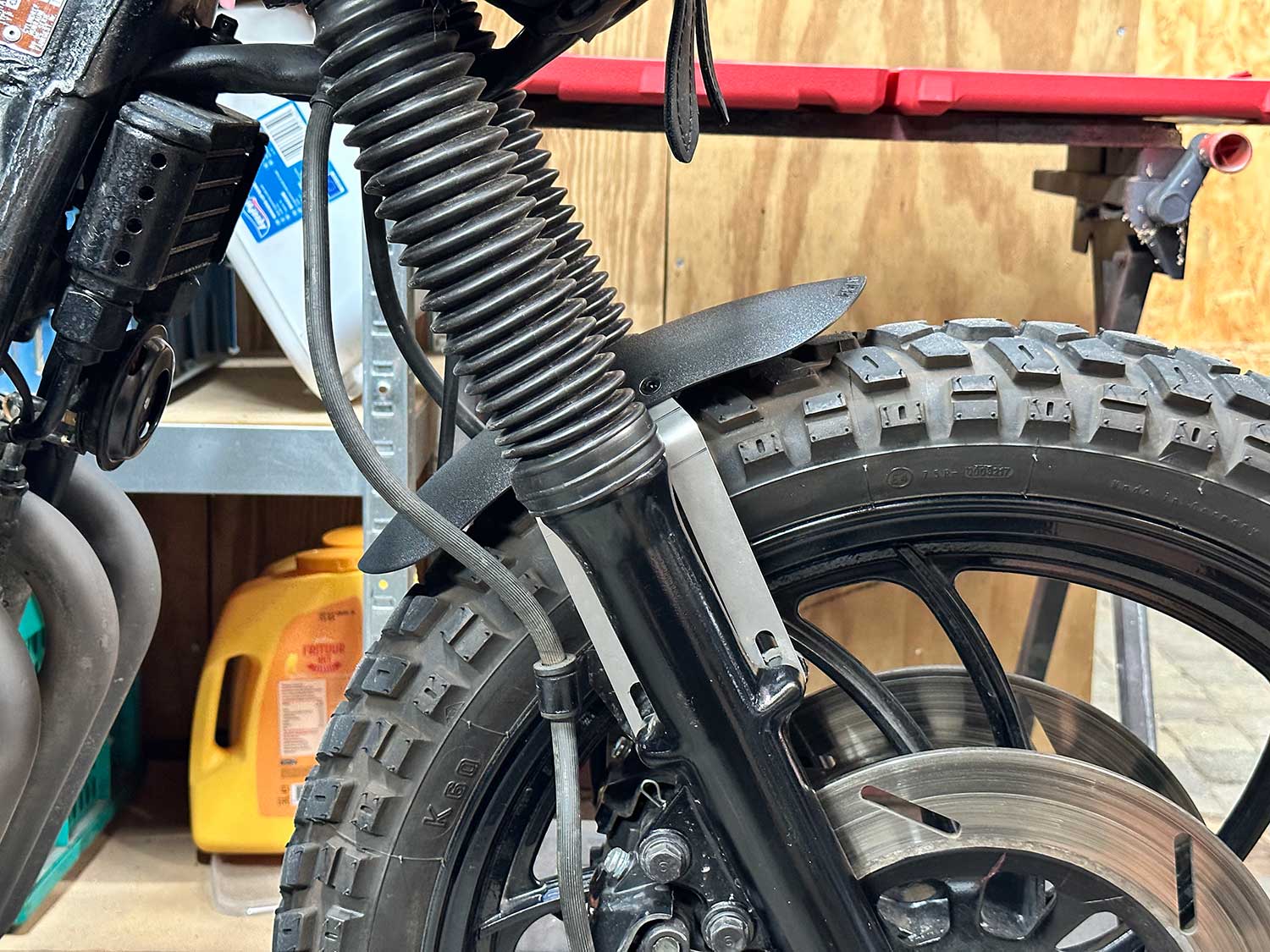 These beautifully finished front fenders are specially made for the Yamaha XJ550, 650, 750 and 1100. The black fenders are very neat due to the textured finish. The brackets are made of 3mm stainless steel, and can be sprayed in color if desired. Because the brackets have a slotted hole, the fender is adjustable in height.