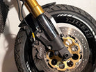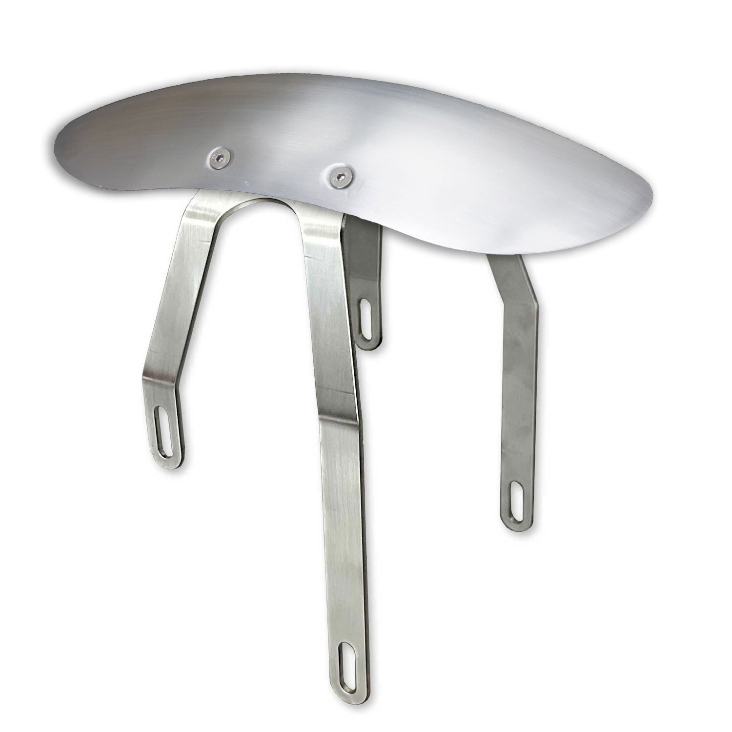 These beautifully finished front fenders are specially made for custom bikes with a Suzuki GSX-R Fork conversion. The brushed aluminium fenders are crafted with great pride. The brackets are made of 3mm stainless steel, and both the fender and brackets can be painted in color if desired. Because the brackets have a slotted hole, the fender is adjustable in height.