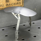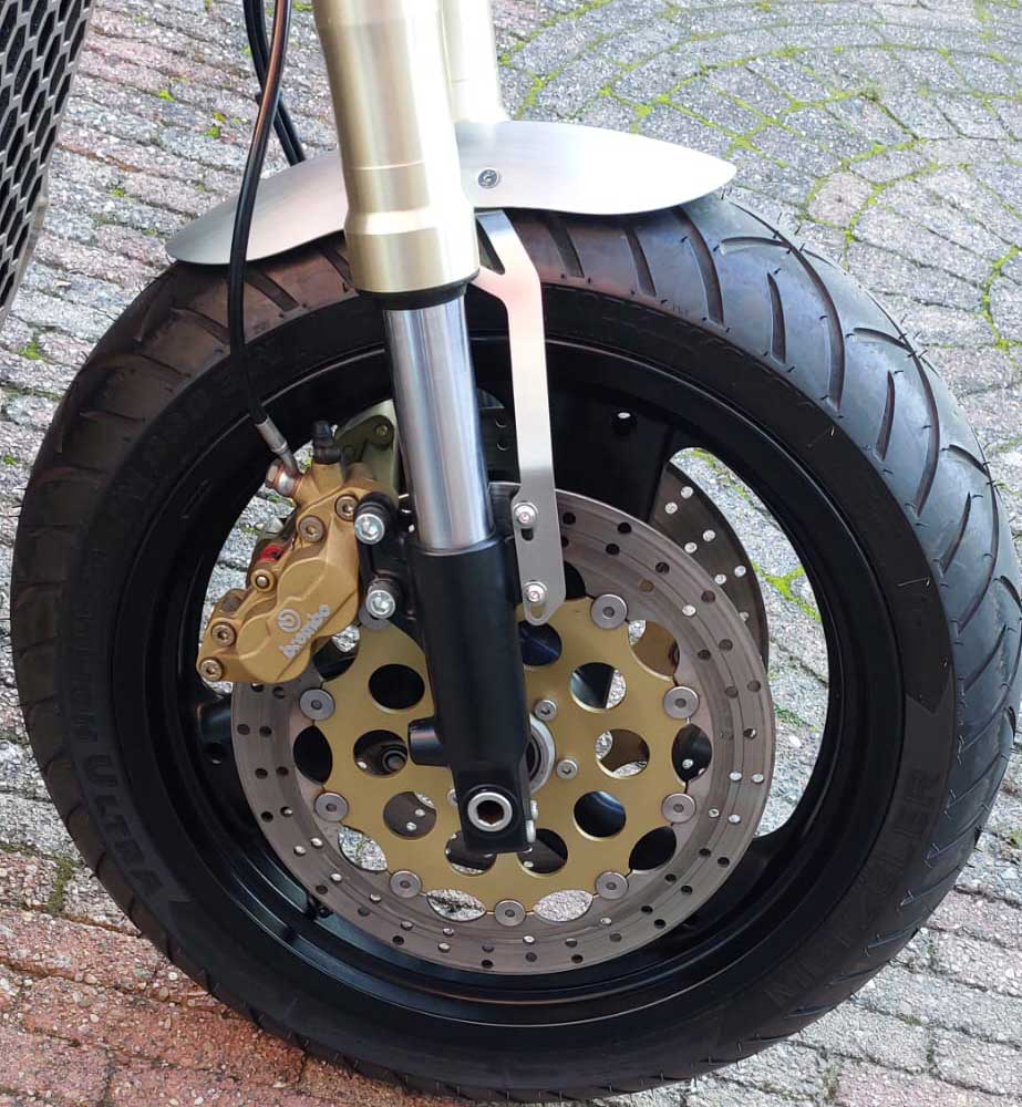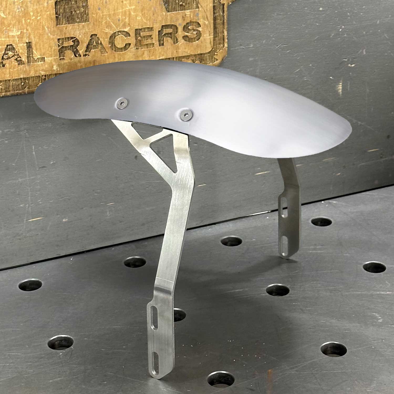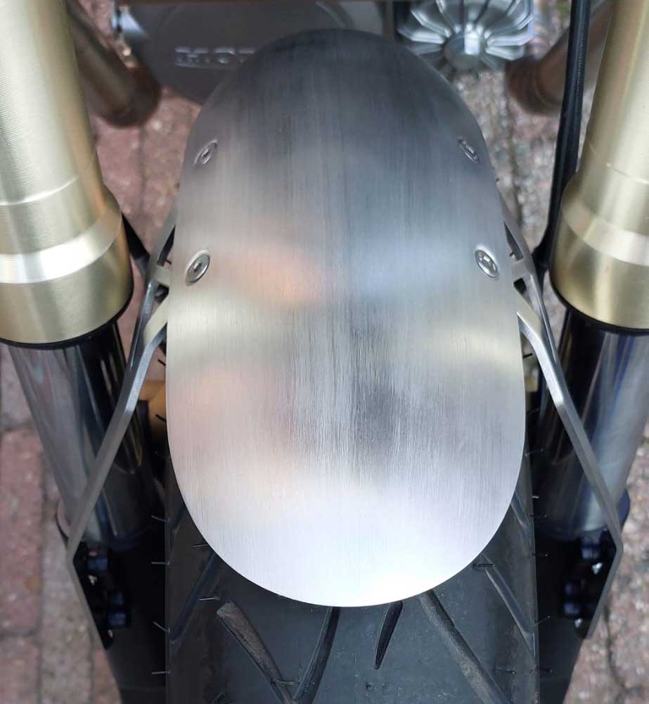 These beautifully finished front fenders are specially made for custom bikes with a Ducati Monster 400, 600, 750 or 900 fork conversion. The brushed aluminium fenders are crafted with great pride. The brackets are made of 3mm stainless steel, and both the fender and brackets can be painted in color if desired. Because the brackets have a slotted hole, the fender is adjustable in height.