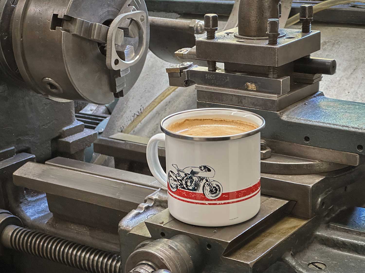 Perfect to serve your daily dose of caffiëne, or a nice cup of tea. You can even use this mug as a makeshift oil pan for your leaking Harley!